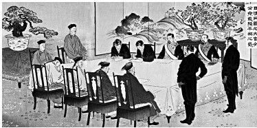 上图:日本人所绘《马关条约》春帆楼谈判场景。