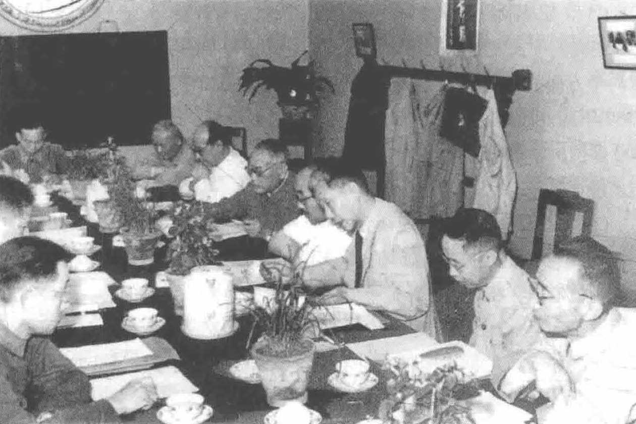 1956年,生物学分组讨论(右起:王家楫、童第周、伍献文、刘矫非、陈桢、秉志、张春霖、XXX、陈世骧、刘承钊)