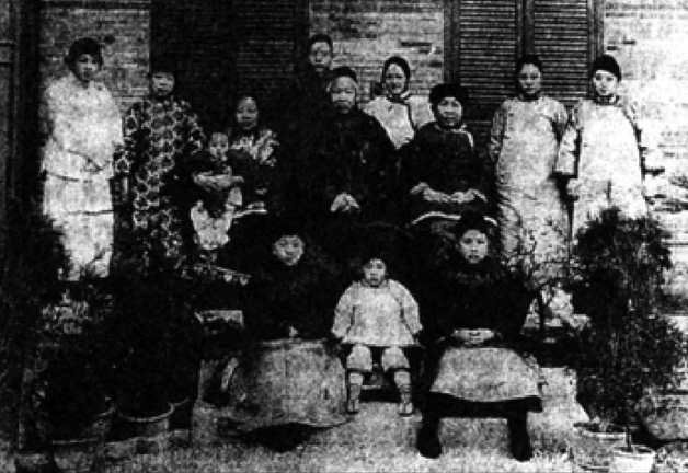 康有为全家福,1921年摄于上海。中排右起:五夫人廖定徵,四夫人市冈鹤子、元配张云珠、康有为、二夫人梁随觉、六夫人张光