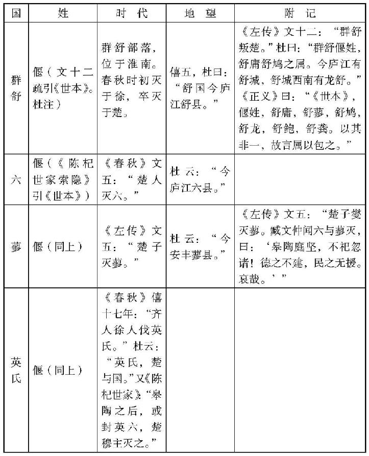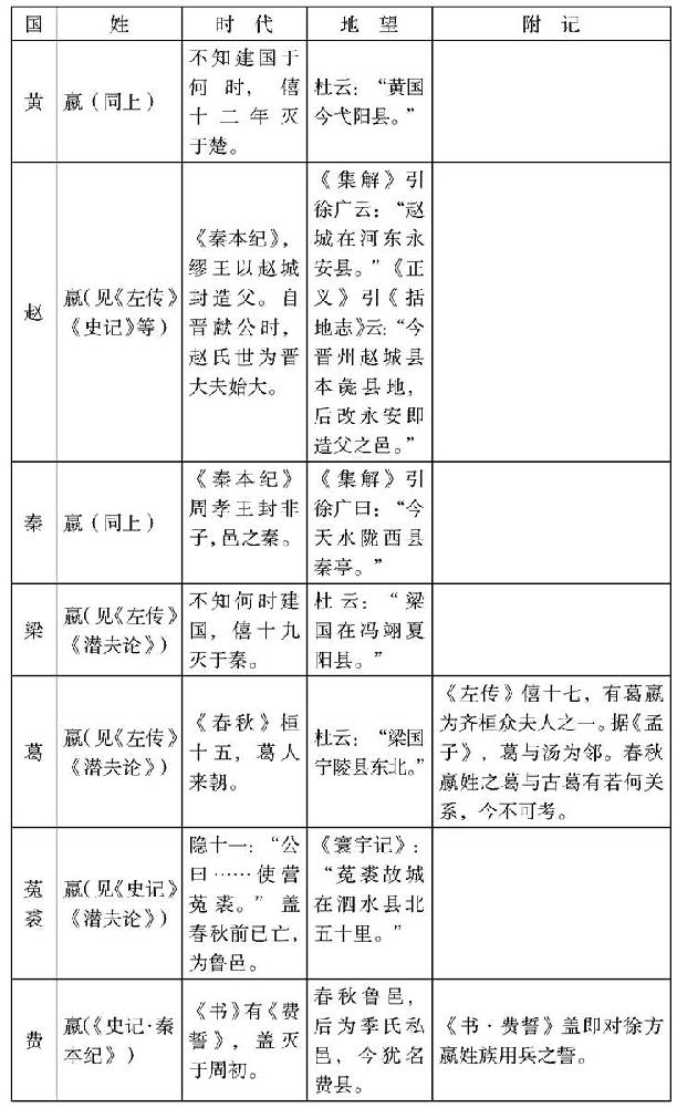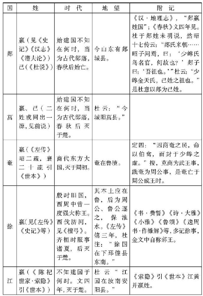 据上表,足知少皞后世之嬴姓一支(宗少皞之己姓国在内)分配在今山东南境、河南东端,南及徐州一带。殷代有奄,为大国。有费,鲁公灭之。益鲁地本嬴姓本土,所谓“奄有龟蒙,遂荒徐宅,至于海邦,淮夷蛮貊”,是指周人略嬴族之故事。因周人建国于奄土,嬴姓乃南退保淮水,今徐州一带。及周人势力稍衰,又起反抗,西伐济河。周人只能压迫之,却不能灭之,故曰“徐方不回,三日旋归”,可见是灭不了的。入春秋,徐始式微,而殷人所置嬴姓在西土者,转而强大,其一卒并天下。其别系偃姓在今安徽北部、河南东南隅以及湖北东境者,当亦西周时淮夷部队中人,入春秋,为楚所并。夏商虽有天下,其子孙犹不若此之延绵。若东方人作三代系统,必以之为正统无疑。