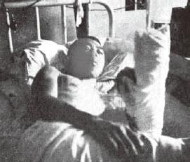 祝鸿信在医院中,可以看到其腿部骨折。