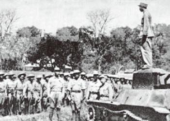 远征军50师师长潘裕琨在给部下讲话,脚下踩的就是一辆被俘的日军战车。