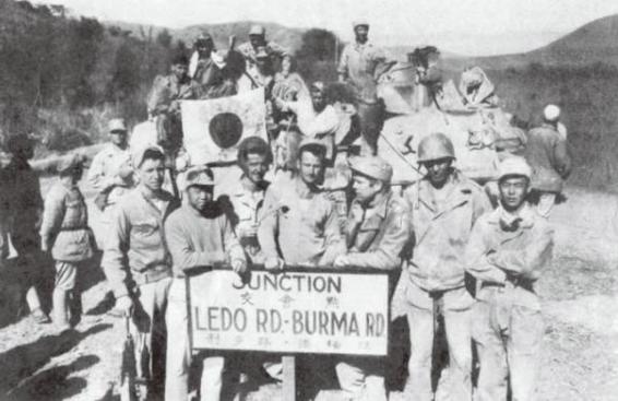 装甲部队人员在中印公路与滇缅公路打通的路标处合影。