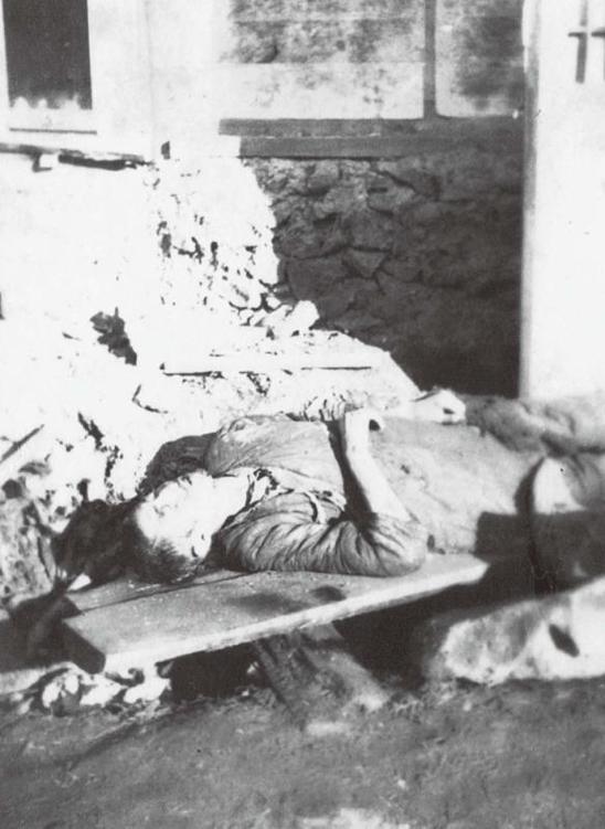 牺牲的抗联战士。铃木在这张特写照片的说明中称其身着便衣,在营门用手枪向外射击,被击中左胸倒地。日军试图在担架上对其注射强心针进行抢救。但此人因伤重而死,至死一言未发,没有任何口供。