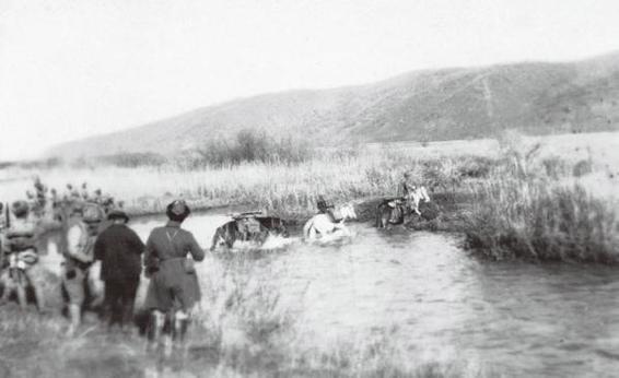 这张照片,按照说明应该拍摄于1938年10月中下旬到11月之间,地点在黑龙江东部佳木斯周围地区。从图片上看,植被尚未落光,显示那一年东北地区似乎是暖冬。这一点我曾有所怀疑,但是,在相册中的确还有铃木当年11月份仅穿一件毛衣在户外的照片,说明那一年的暖冬可能确实存在。