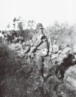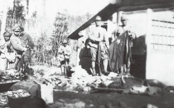 左侧,有三名日军士兵在检视抗联战士遗留的物品,后方正中还有一名日兵在用通条处理枪膛。可以看到一部分日军已经更换了冬季军服,而另一部分还穿着夏秋制服。由于永野讨伐队是日军不同部队混编而成,所以这可能反映了日军部队不同的补给情况。