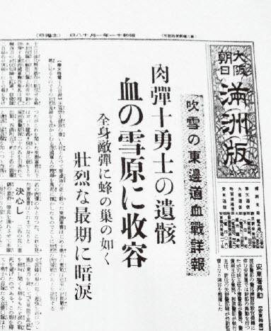 〈奉天专电16日发〉在东边道作战中凋谢的东濑军曹等十名勇士,为建设王道乐土而化为尊贵的人柱(为何让我想起了《鹿鼎记》中的人棍?皇军喜欢这个调调?)。他们在近来讨匪战斗中表现出来的英勇行为,惊天地,泣鬼神,他们作为皇军精华发动的肉弹攻击将光耀万邦(光耀万邦未必,但别的国家的确没有用这种打法的),特此详报。