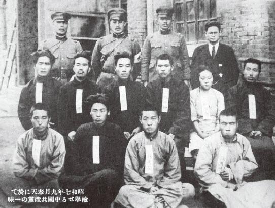 下图是在伪满的日军给日本国内军人抚恤协会提供的照片之一,从说明来看,是日军驻沈阳宪兵部队1932年9月,根据叛徒出卖破获一个共产党地下抵抗机关,这是被捕成员的合影。尽管被捕抵抗志士身上都挂有名衔,但因为照片尺寸问题只能辨认出二排右侧一人名似为李玉文,另有一人姓张,一人姓崔。