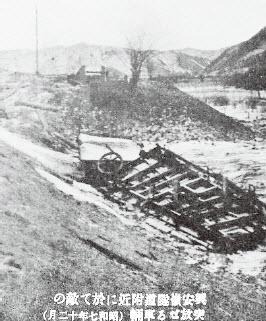 1932年12月,中国抵抗战士在大兴安岭隧道附近伏击摧毁的日军巡道车。