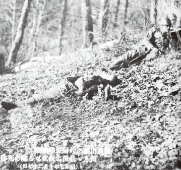 根据日军记载,这张照片拍摄于1938年10月27日的战斗中。日军此时正向通化攻击前进,在龙岗山隘口遭到中国军队的顽强抵抗,在画面左方的,就是一名战斗到最后一刻直到牺牲的中国战士,可以看到这名战士打着当时中国共典型的绑腿。遗体已经被搜过身,而战斗还在继续。