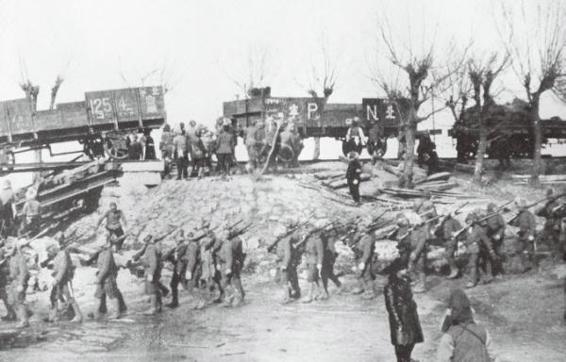 尽管东北军因不抵抗主义退出东三省,但东北军民仍在艰苦条件下顽强抵抗——东北义勇军1932年在东北白旗堡摧毁的日军军列。