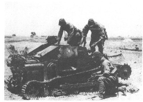 这种意大利制CV-33菲亚特战车是一种小型战车,乘员两人,重不过3吨,仅装备着9毫米或者7.62毫米机枪。这种战车和日军称为“豆战车”的94式轻型坦克属于一个级别,火力和装甲方面还要弱一点。抗战之前,中国军队曾经从意大利购买了若干这类战车使用。限于国力,虽然急于发展自己的装甲部队,中国购买的却只能是最为便宜的装备。意大利自己也大量使用这种战车,占了二战中意军战车的75%,但是战绩不佳。