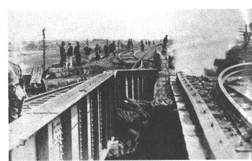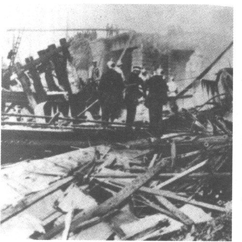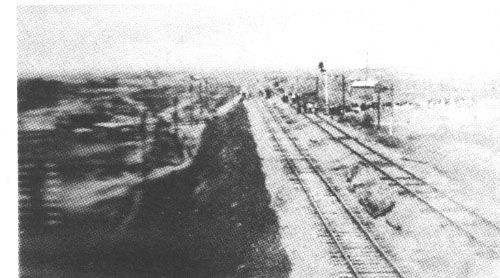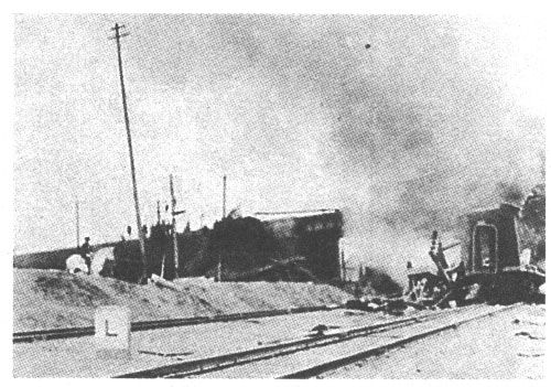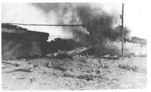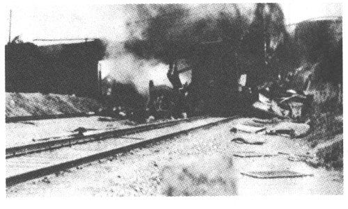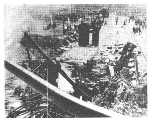 图十二为上层路桥被炸坏的钢轨垂挂下来,可见爆破之严重。
