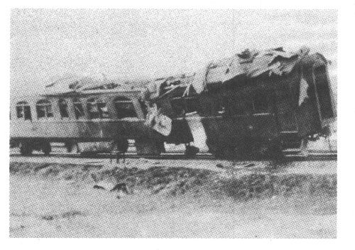 图七为爆炸现场,可以看到残存车门的,就是张的座车8号车。因为8号车被炸,和7号车脱钩,前面七辆车厢继续前行,使8号车在画面上仿佛成了第一节车厢。