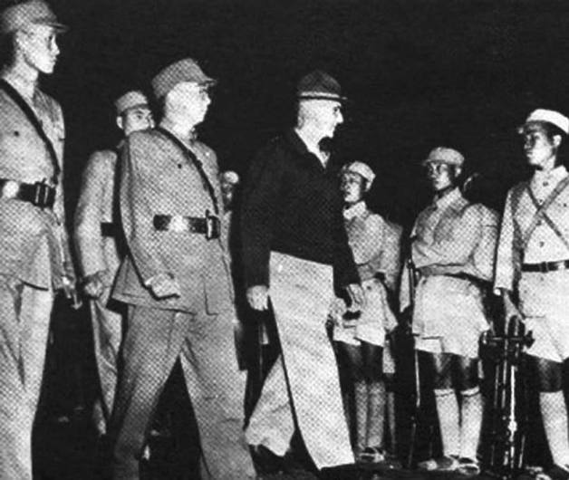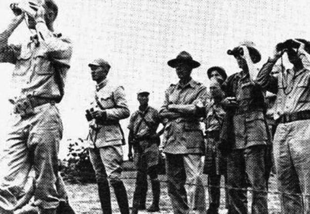 中美两国将领检阅远征军部队,右侧的美国将领是史迪威,左侧的两名中国将领是孙立人和罗卓英。