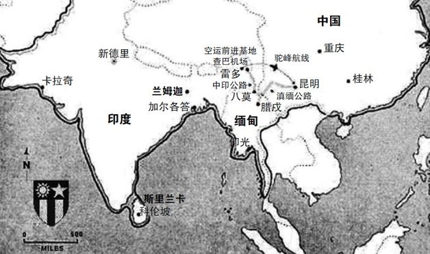 美军“梅支队”军用地图(地名译文为笔者所加),上标有中国最后的对外联系通道——驼峰航线。