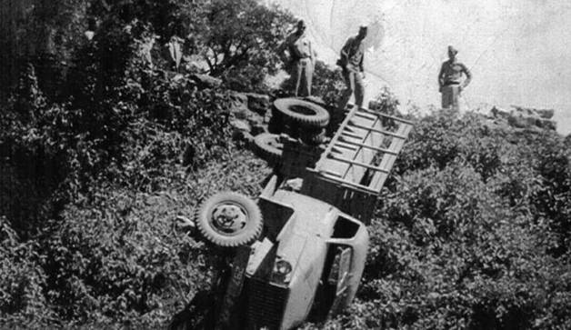 野人山—胡康河谷是道路崎岖的地方,并不利于美械机械化部队的行进和展开。图为远征军翻车事故现场。