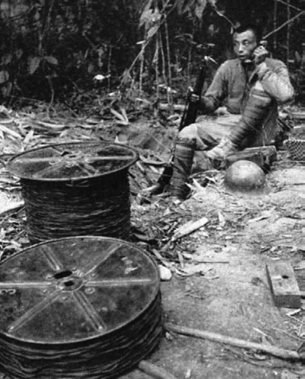 胡康河谷战场实态。这是一名中国远征军驻印军通讯兵,在他的身后是一个避弹坑,在他前面是一个缴获的日本钢盔。他正在利用战地电话与后方通话,他的任务是使部队主力能够随时发现敌人任何向我军侧翼的迂回袭击。