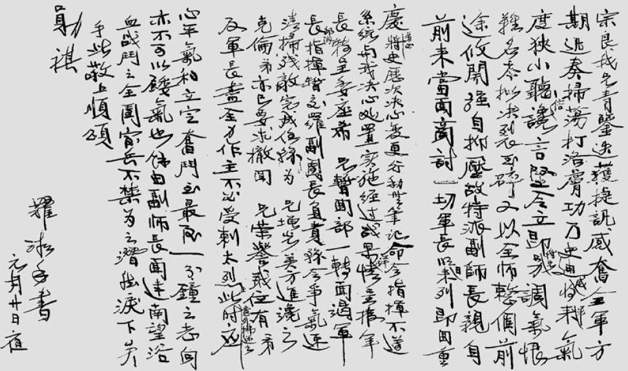 宗良我兄青鉴:迭获捷讯,感奋全军,方期迅奏扫荡打洛成功,乃史迪威将军来,气度狭小,听信谗言,坚令立即将兄另调。气恨莫名,本拟决裂玉碎,又以全师整个前途攸关,强自抑压,故特派副师长亲自前来,当面商讨一切。军长昨日来列即回重庆。弟必将史历次决心变更行动等笔证,命令指挥不遵系统,与我决心处置实施经过、战果等情呈报军长转呈委座。希兄暂回部一转,面谒军长,部队指挥暂交罗副团长负责,预令争气速清扫残敌完成任务为(要)。兄所述美方进谗言之克伦,弟亦已要求撤回。兄荣誉职位有弟及军长尽全力作主,不必受刺太烈。在此意外拂逆之时,应心平气和,立定奋斗至最后一分钟之志向,亦不可以诿气也。现由副师长面达,南望浴血战斗之全团官兵,不禁为之潸然泪下矣。手此敬上。顺颂勋祺。耀湘手书元月二十日夜