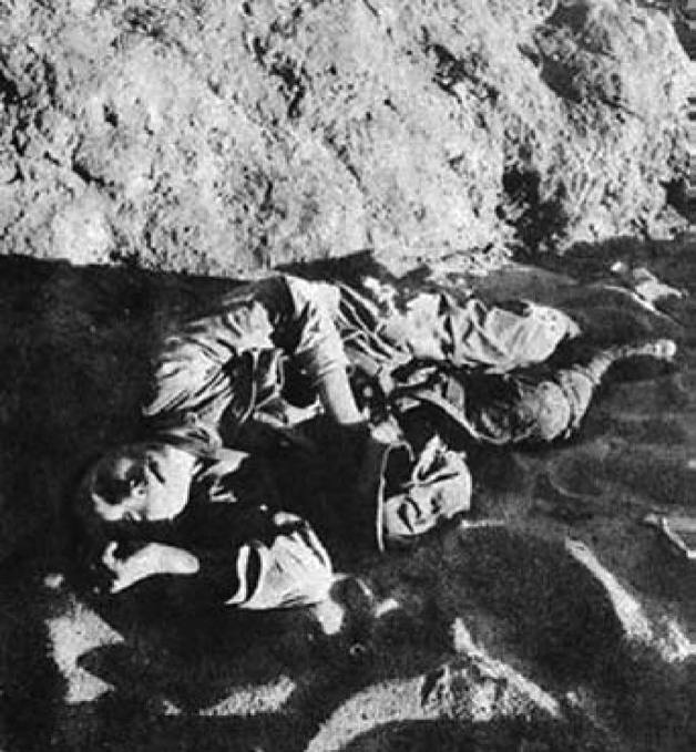 战斗中被击毙的日军。战斗记录这名日军狙击兵试图跳河逃跑,他几乎成功了,但中国士兵的子弹追上了他。