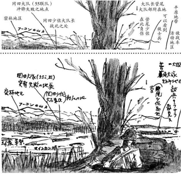 井上咸所绘孟关之战与冈田大队长战死的经过(虚线以上为译文)