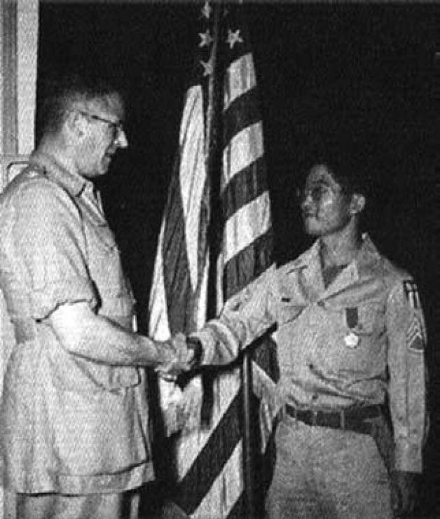 梅里尔准将给“抢劫者”部队中的日裔军官山本罗易授勋