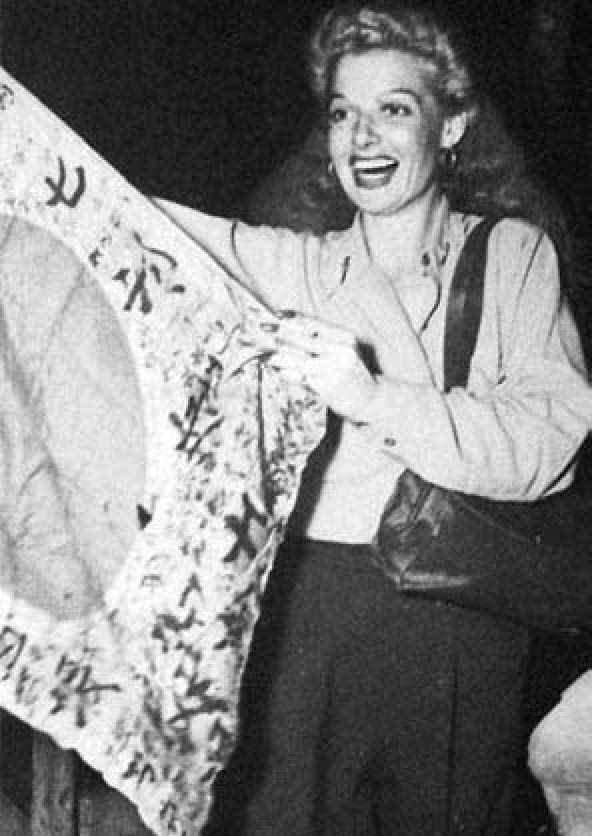英国歌星安妮·谢尔顿到缅北演出后获赠一面缴获的日军军旗,大喜过望。安妮·谢尔顿是当时欧美最性感的明星之一。