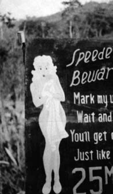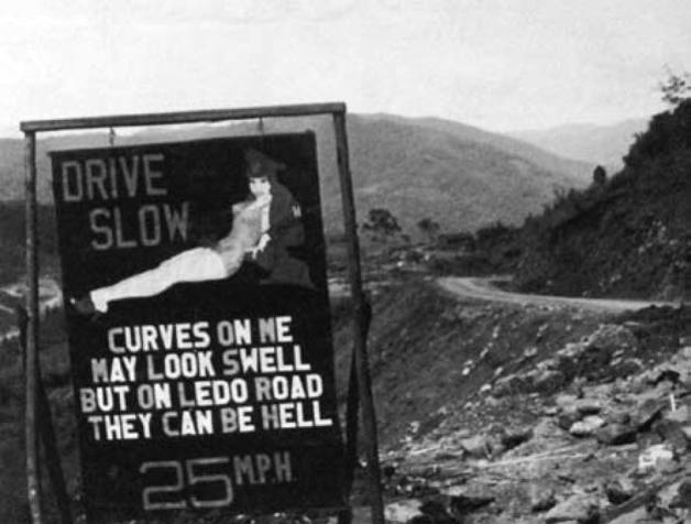 中印公路急转弯处美国工兵设立的路标——开快车的家伙,记住我的话走着瞧,你会像我一样被抓起来(估计路边有宪兵)。