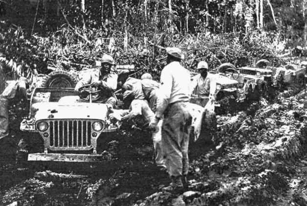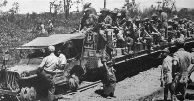 好在中美方面开动脑筋,很快就有了招数。不知道是哪个美国兵发现,把美国陆军使用的威利斯·奥佛兰军用吉普卸去外胎,正好可以在缅甸的窄轨铁路上跑。威利斯·奥佛兰军用吉普就是史迪威在缅北征战使用的座车,被形容为“像狗一样忠诚,像骡子一样强壮,像羚羊一样机敏”。这种有一台4缸汽油发动机,载重1.25吨的吉普车当牵引车,比缅甸原来的小火车还要好。于是,在缅北战场上,一种奇特的运输工具诞生了——由吉普车拉的火车。有时候,车厢比较多,为了让这种火车跑得更快,还要动用两辆吉普,一辆在前面拉,一辆在后面推。