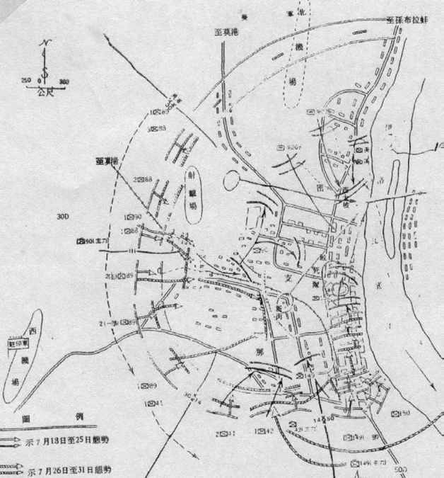 “我军在长约15公里的正面火线上成了一个弓形,伊洛瓦底江恰似弓弦,把密支那的日军夹在大江和盟军弧形包围圈之内。战斗初起,是在距城十里左右的小山头和村庄里进行,我军逐步前进,每天与敌军只能争夺30米、50米的阵地,因而敌我的伤亡皆极惨重。20余日以后,敌军被迫放弃村落,改守距城六公里的丛林、山地。在这段期间,敌军凭堡垒负隅顽抗,我军曾采用坑道作业的掘壕战法,避免伤亡,从坑道接近暗堡,渐渐将城郊阵地攻略,拔除敌之坚强据点,而进入密支那城的市街战斗。敌常利用夜幕掩护向我军偷袭,企图拖延时日,以待增援。我空军和炮兵不分昼夜,向城区及伊洛瓦底江东岸轮番轰炸、扫射、炮击,市内建筑物大部被毁;敌后从事补给的船只和往返于宛貌(Waingmaw)公路间的汽车,也完全在我军的炮火射程制压之下。后来,敌又改向通往密支那公路的中途,夜间用汽车把粮秣、弹药偷运到江边,再用木板和树排送过江来维持补给。被困在城内的日军,便躲在用铁轨掩盖的坚固工事里死守起来。”