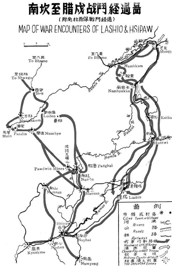 担任主攻的,是左路孙立人所部中国远征军部队新一军,从密支那沿伊洛瓦底江顺流而下,从西北向东南方向攻击前进,目标直指八莫。中路廖耀湘的新6军第50师则向南直插,从八莫以南的南支(Nauchye)、曼那等地直取西堡(Hsipaw,也有翻译成“细胞”、“昔卜”的),从战术上看,似乎是要肃清八莫以南的日军第2师团策应部队,掩护新一军对八莫的攻击。而在这支策应部队的南边,还放了一支莫名其妙的右纵队,这个右纵队不是中国军队,主力是英国陆军第36师。