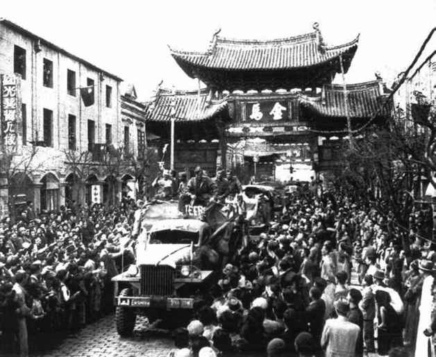 1945年2月4日,中印公路通车后第一支车队到达昆明,成万市民夹道欢迎。