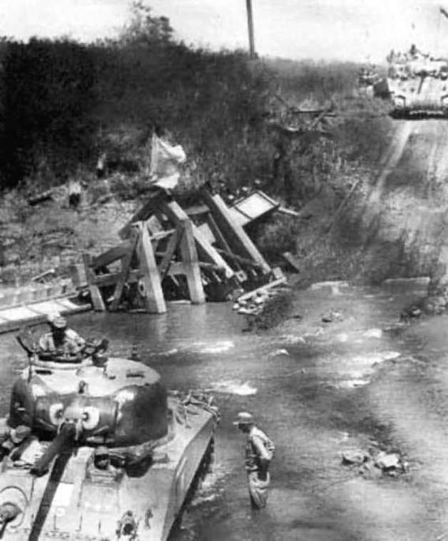 日军炸毁河上的桥梁试图阻挡追兵,中国坦克兵驾驶战车徒涉溪河继续追击。