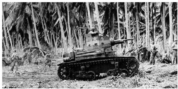 在岛上纵横驰骋的M2A4轻型坦克。这种坦克的原型是英国的维克斯坦克,火力和装甲厚度都一般,但用来对付步兵还是够格的