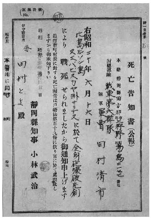 日军阵亡通知单。日本拥有近百年的户籍历史,在征兵方面有着完备的手续,军人的荣誉和优抚也比较有保障。日本兵普遍作战勇敢、拒不投降以及投降后不愿透露真名实姓,与这一制度有着密不可分的联系