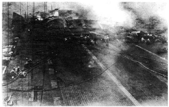 轮机室不知如何作答,只简单地报告了情况:“有四发炸弹落在左舷飞行甲板,两发炸弹落在尾部升降机附近。”