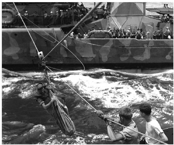美军正在用裤型救生圈把落水者从一艘驱逐舰吊到另一艘巡洋舰上去。即便不遭到对方的杀害,在饥饿、鲨鱼的威胁下,落水者的生存概率也非常低,照片上这名水兵属于幸运儿