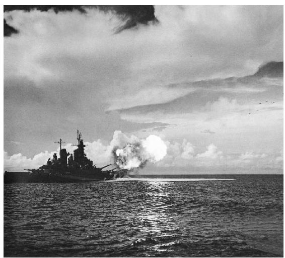 美军战列舰的16英寸舰炮齐射。作为1941年完工的新型战列舰,“华盛顿”号在主炮火力、主装甲带、水平防护等各项指标上已全面超过“雾岛”号