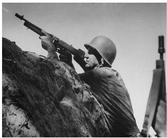 艾克尔伯格在前沿持枪射击。士兵也是需要被征服的,特别是在艰难时刻,任何技巧、外表、才华、煽情都没有用,但是只要看到总指挥拿着一杆枪冲到前面,大家伙便会哇哇叫着自动跟上来
