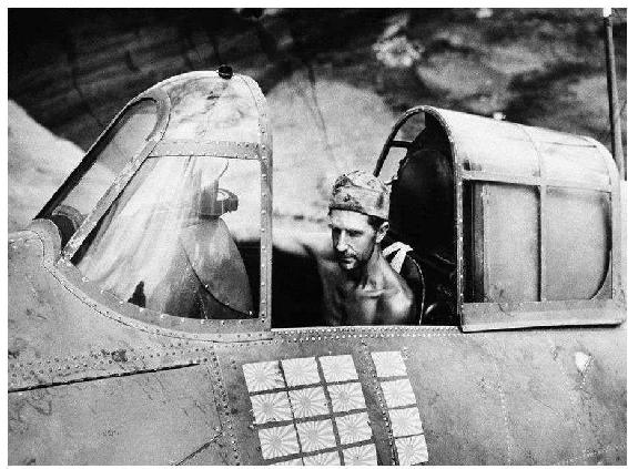 飞行员格林伍德坐在“野猫”战斗机的座舱里,这位赤膊上阵的“裸男”已经击落了19架日机