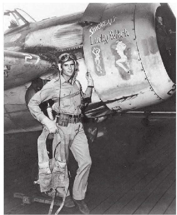 “甘比尔湾”号上的飞行员与他的“野猫”战斗机。虽然“甘比尔湾”号被击沉,但飞行员仍可驾机作战,他们的英勇表现挽救了“塔菲-3”