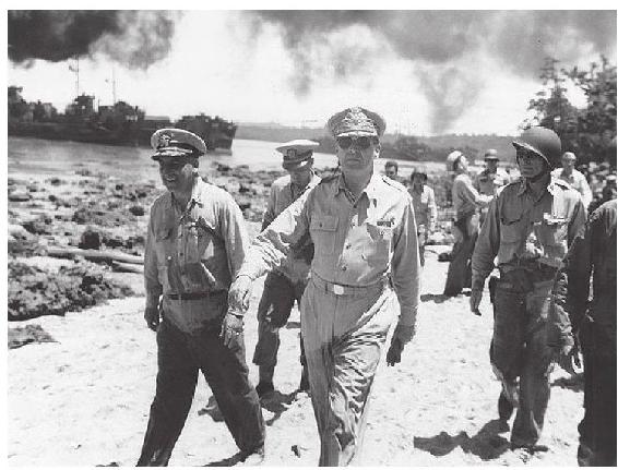 正在视察前线的麦克阿瑟。老麦从来就不是一个纸上谈兵的将领,在菲律宾战役中,他沿续了这一风格