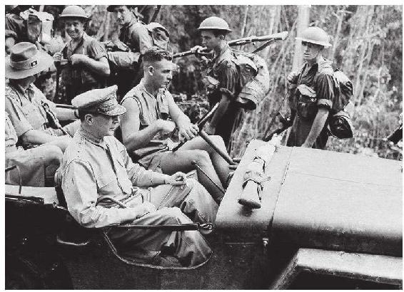 行不多远,他们被一个澳大利亚上校给拦住了,表示这里已进入了最前沿,十分危险,不能再往前去了。麦克阿瑟用手一指,说他已经看到了,前面至少500码外的地方全是澳军,哪儿是什么最前沿。