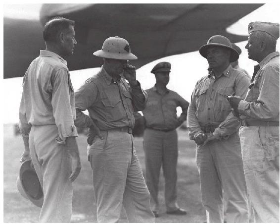 长期指挥两栖登陆战的美军高级指挥官,左一是斯普鲁恩斯,左二是霍兰·史密斯。他们不同的性格作风,从神情动作中就可以看得出来