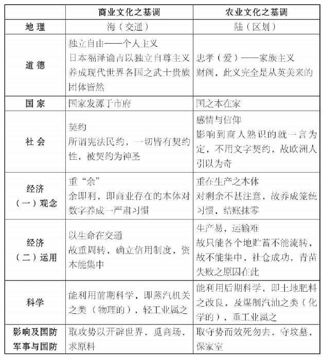 “有无相通,供求相应”,这是商业精神,即商业生活的一种基调;“自给自足,无求于人”,这是农业精神,即农业生活的一种基调。这两种生活基调根本不同,所以影响到思想、制度、习惯(总言之为文化),处处成一对立的状态,但是实际生活上农人免不了交易,商人也得注意原料,所以农商之间既有调和,又有冲突,结果更有演变。我用这一个基本观念来看欧洲的历史,自觉另有一种色彩;并且用此来解释现在所谓“全般欧化”“中国本位”的论争也觉得比较妥当。如今且将农业、商业两种生活的不同方面来对照一下: