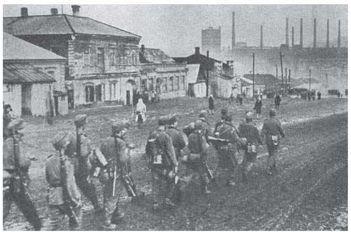 一群德军补充兵穿过被占领的俄国城镇,赶往他们要加入的部队。