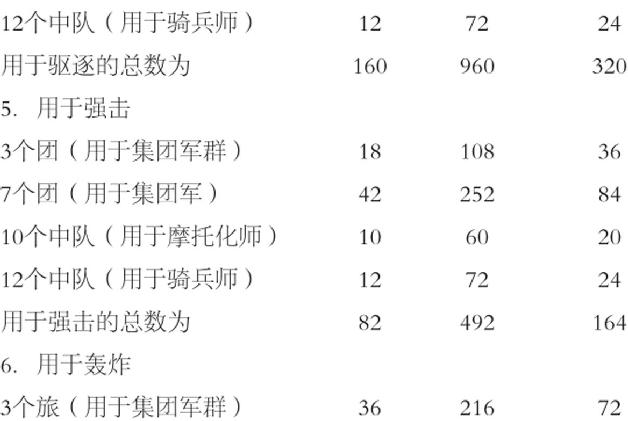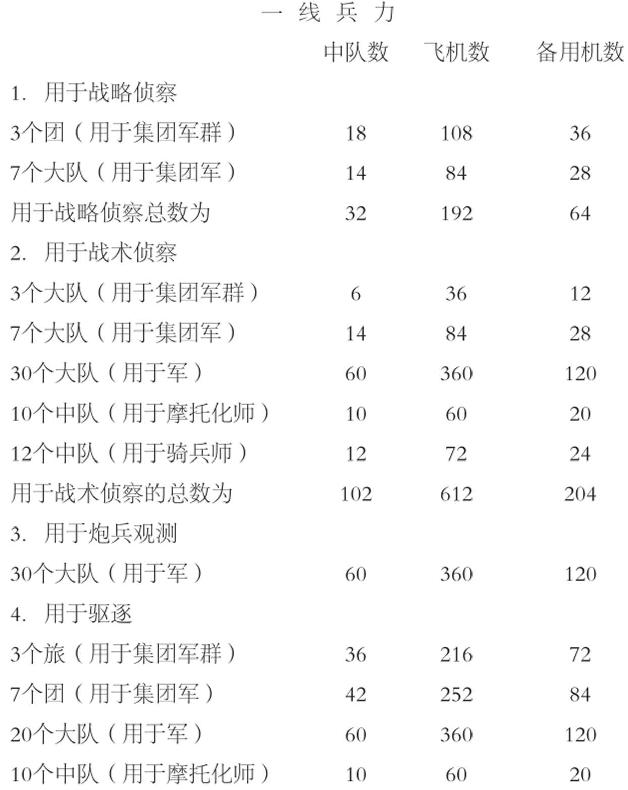 由于已经决定首次动员时要召集3个集团军群,包括7个集团军,30个军,10个摩托化师和12个骑兵师,故可预测航空兵的组成为: