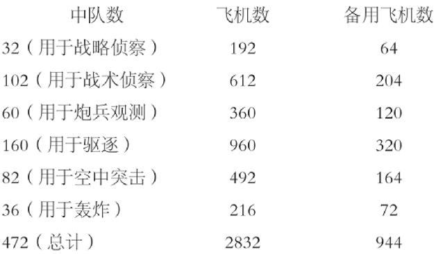1.用于海军基地的防空:60个水上驱逐机中队,共360架第一线飞机和120架备用飞机。