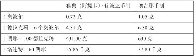 [36] 古代希腊有多种币制,同样的一个货币单位,在埃吉那、科林斯和雅典的分量不一样。希腊较流行的两种币制单位(重量单位)对比如下: