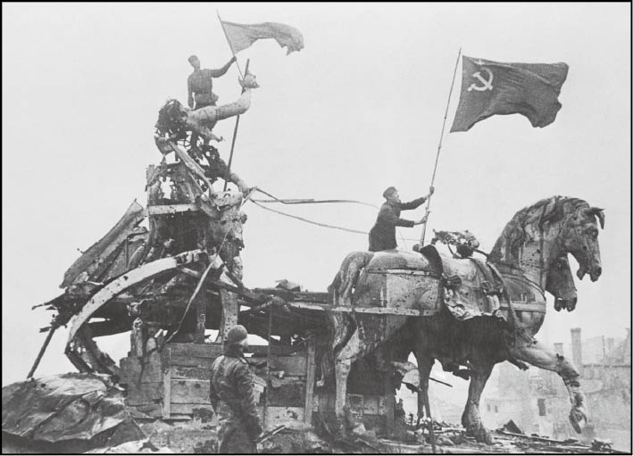 1945年,苏军士兵在勃兰登堡门残存的雕塑上树起旗帜。